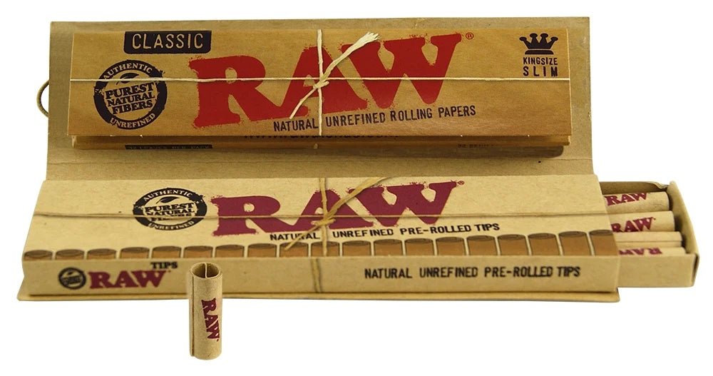 RAW Unrefined Pre-rolled Tips, and a unique outer sleeve with natural rubber band.
