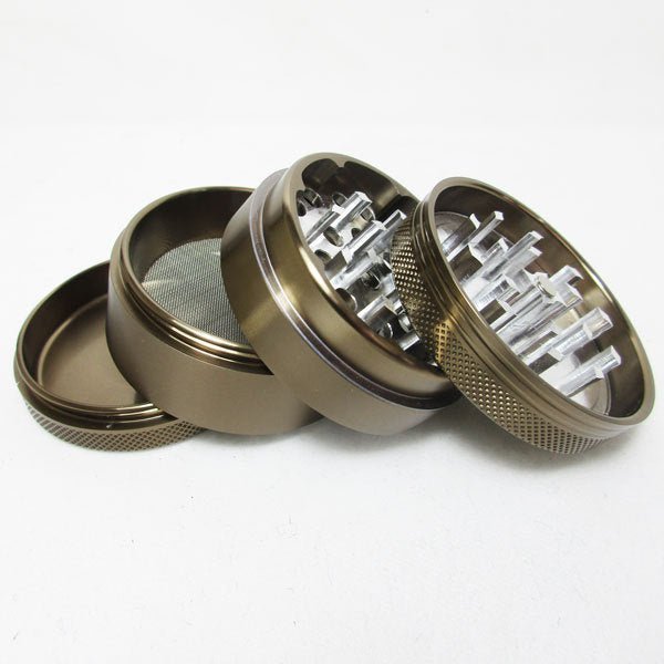 Designed by highly sophisticated CNC machines this 4pce aluminum grinder has a 52mm diameter and measures 42mm high. Two super strong neodymium magnets are used to keep a nice and tight closure. Each grinder is individually boxed and supplied in its own pouch. A small black scraper is included with every grinder.